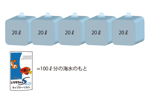 「人工海水」とは、水道水から“海水のもと”となる“塩”を使って作る海水のことで、真水に規定量の“塩”を溶かして海水を作ります。